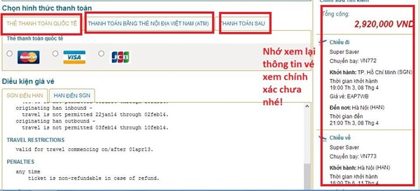 Cuối cùng, sẽ có ba hình thức thanh toán cho bạn chọn( bạn có hình thức nào tiện lợi nhất đối với bạn thì bạn nên chọn vào đó).Có ba hình thức thanh toán cho bạn lựa chọn đó là thanh toán trực tuyến bằng các thẻ thanh toán quốc tế, thanh toán bằng thẻ nội địa Việt Nam (ATM) và thanh toán sau.