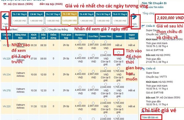 Sau khi tìm kiếm chuyến bay nó sẽ hiện lên bảng kết quả tìm kiếm, giá vé của bạn sẽ được cập nhập. Có thể xem thêm giá vé 7 ngày trước và sau để tham khảo. Sau khi chọn được ngày bay và giờ bay ưng ý các bạn tích vào hình tròn nhỏ bên trên giá để chọn và giá vé chi tiết cùng các thông tin về chuyến bay sẽ được hiện lên ở khung bên phải.