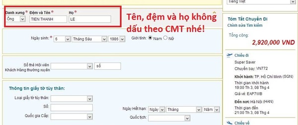 Bạn điền tất cả các thông tin cá nhân của bạn vào ví dụ như trong hình. Nếu bạn là khách hàng thường xuyên có số thẻ hội viên thì nhớ điền vào để được hưởng ưu đãi nhé.