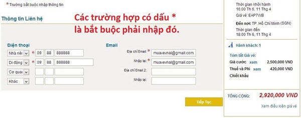 Sau đó bạn điền tất cả các thông tin của mình vào bảng, nhớ điền cả Gmail và số điện thoại xác nhận để có thể được đổi chuyến bay nếu có việc đột xuất.